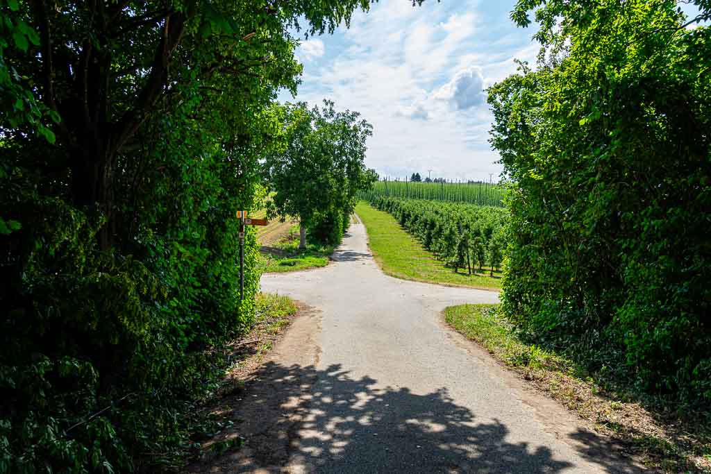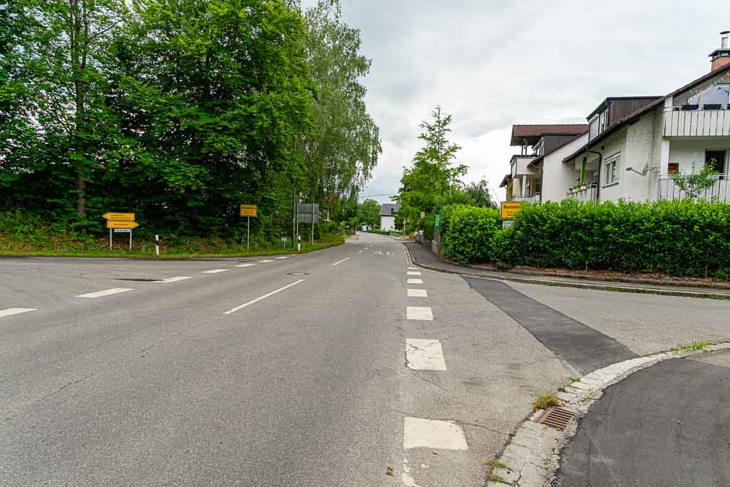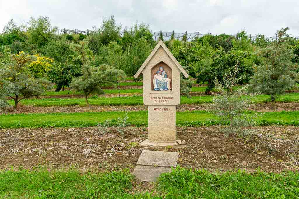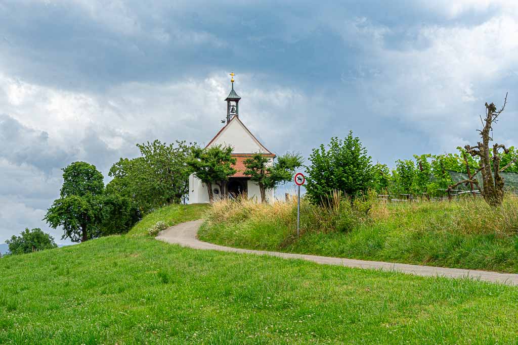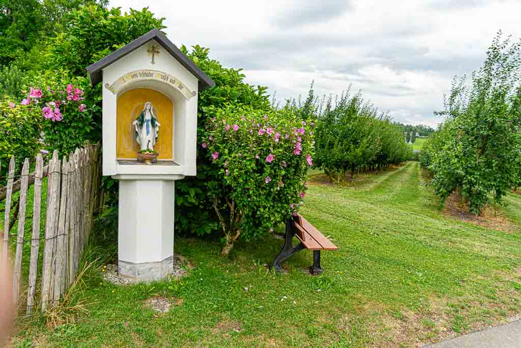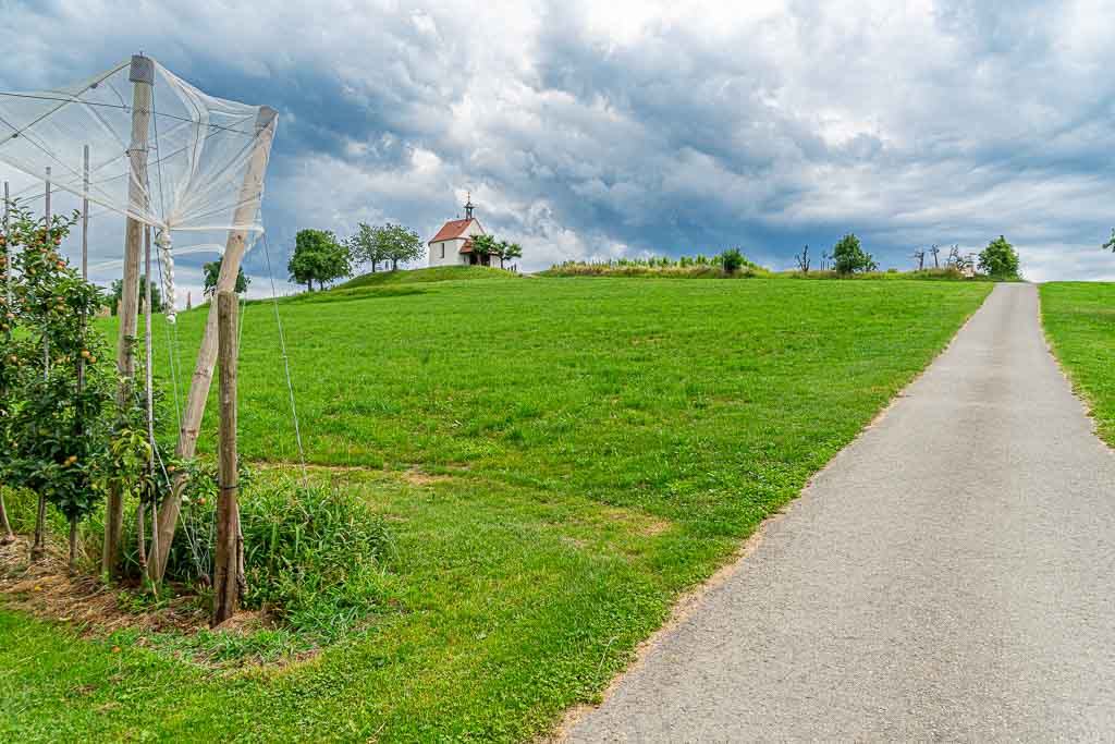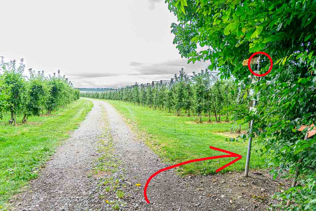 Nach dem Steg über den Nonnenbach steigt der Waldweg kräftig an und führt knapp 250m durch den Wald. Direkt am Waldrand findet sich ein Wegweiser und daran eine Wegmarkierung, die nach rechts weist. Der Weg führt durch eine Obstplantage bis zu einem asphaltierten Wirtschaftsweg. Dort erblickt man bereits die Antoniuskapelle.
