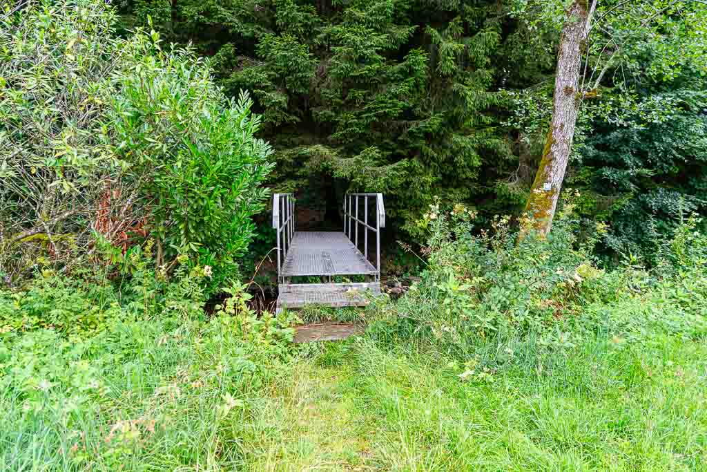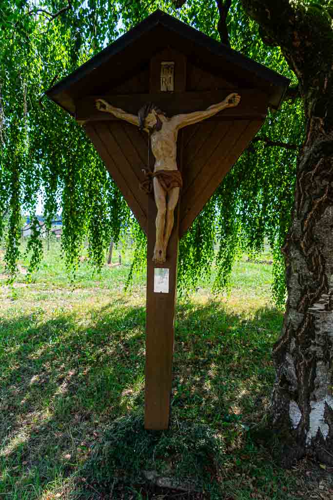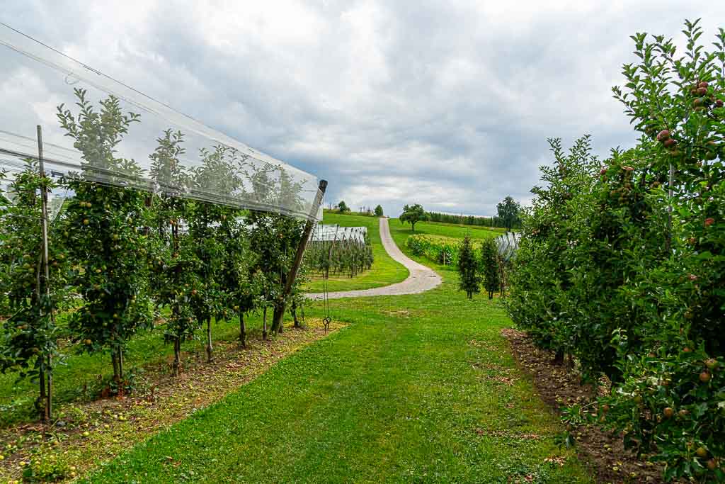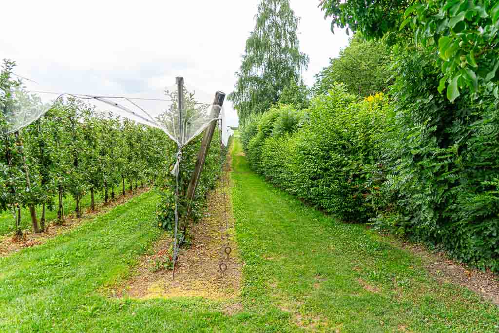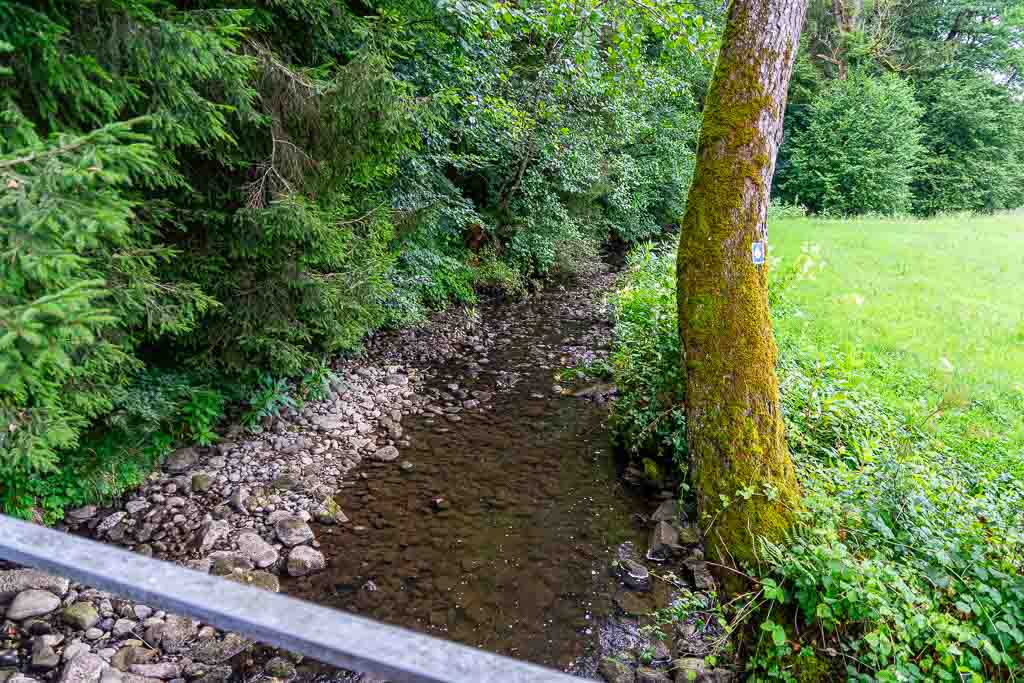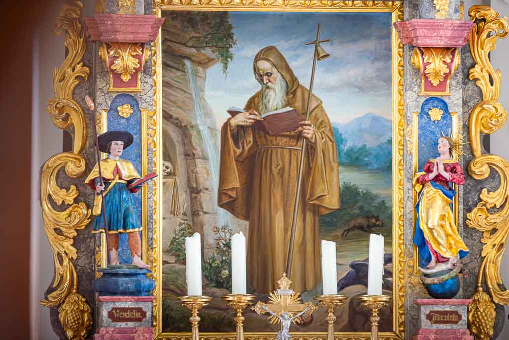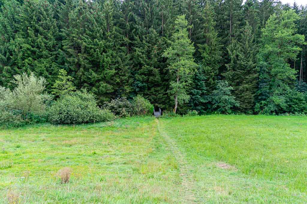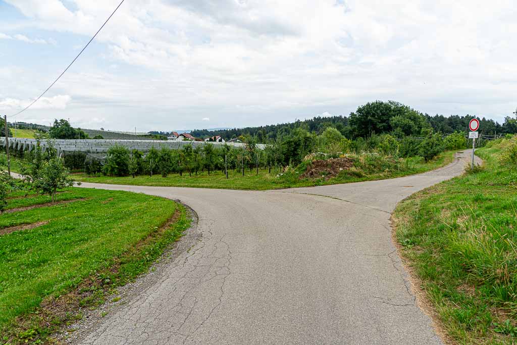Nach dem Steg über den Nonnenbach steigt der Waldweg kräftig an und führt knapp 250m durch den Wald. Direkt am Waldrand findet sich ein Wegweiser und daran eine Wegmarkierung, die nach rechts weist. Der Weg führt durch eine Obstplantage bis zu einem asphaltierten Wirtschaftsweg. Dort erblickt man bereits die Antoniuskapelle.