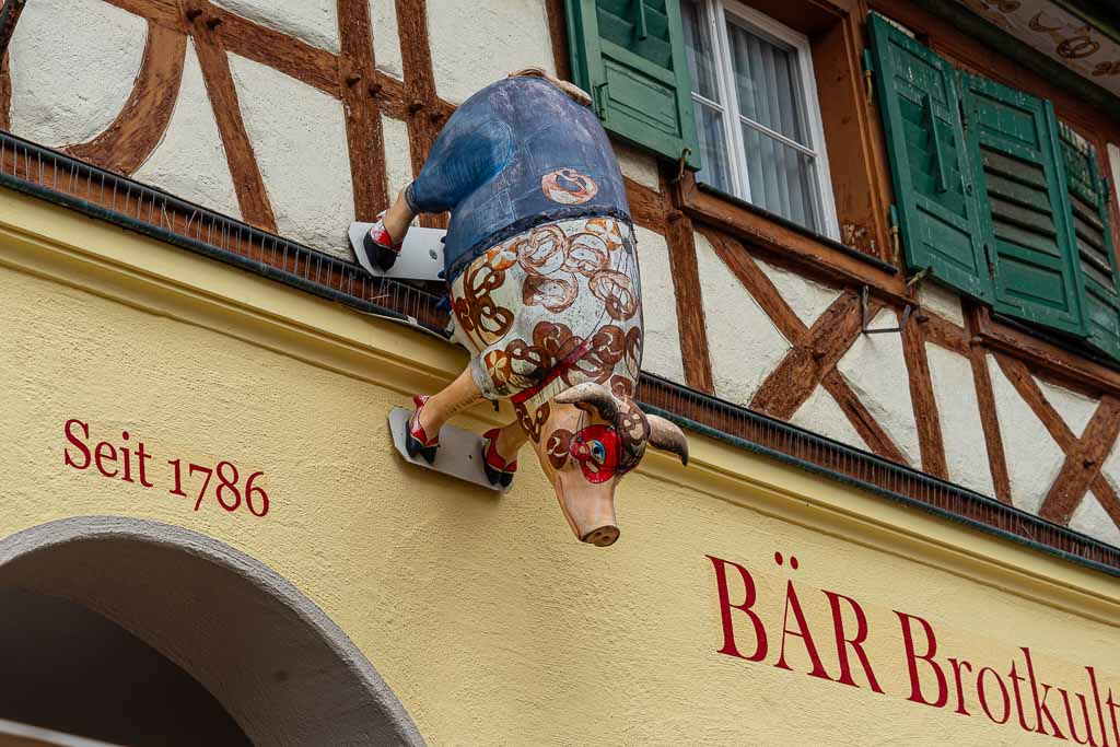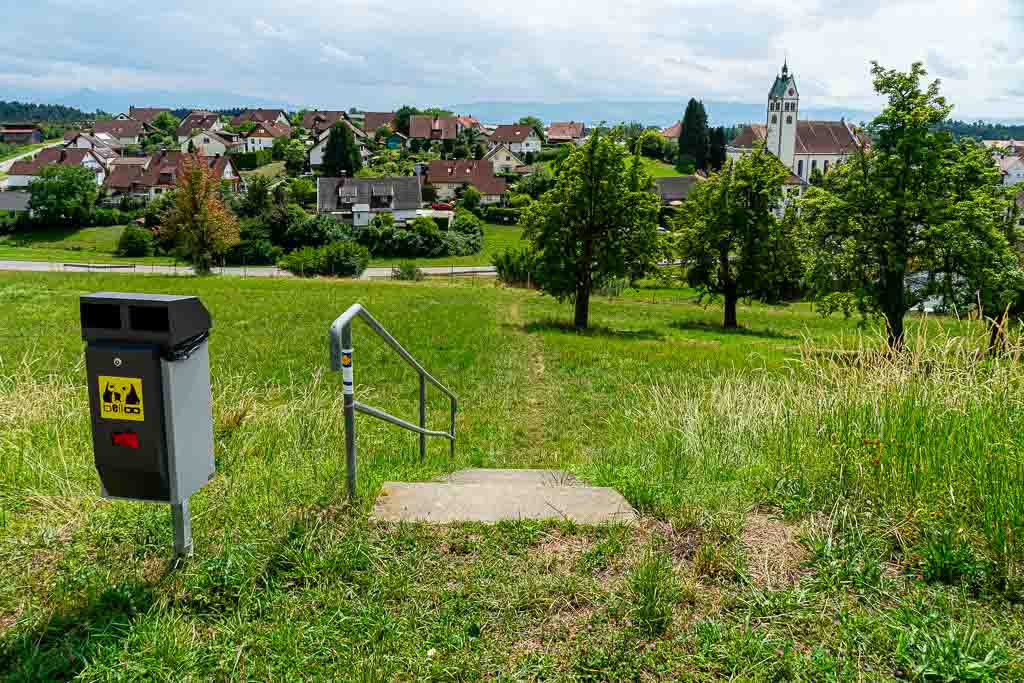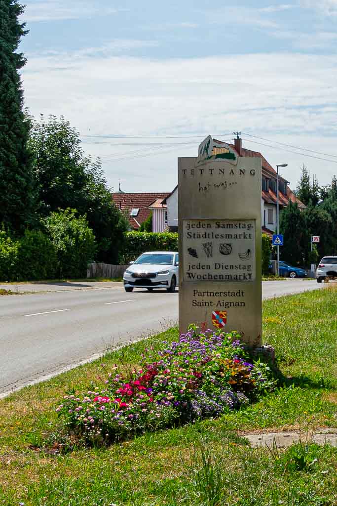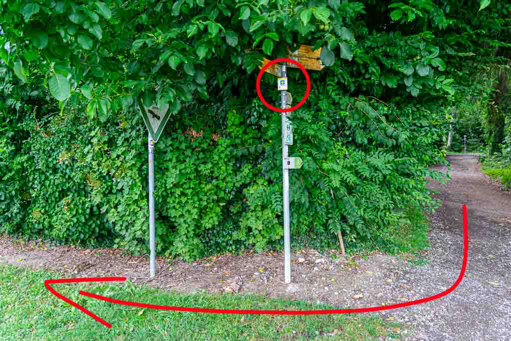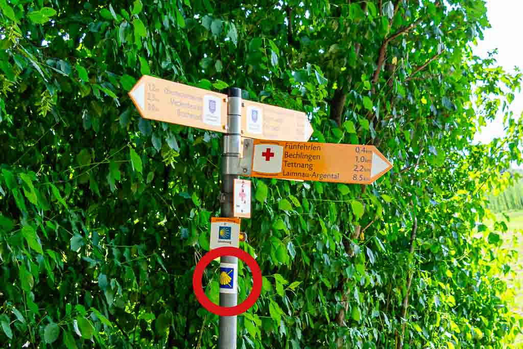 grundsätzlich an den aufgeklebten Wegmarkierungen (gelbe Jakobsmuschel mit zwei Pilgerstäben) und nicht an den Wegmarkierungen "Wandern in Tettnang".
