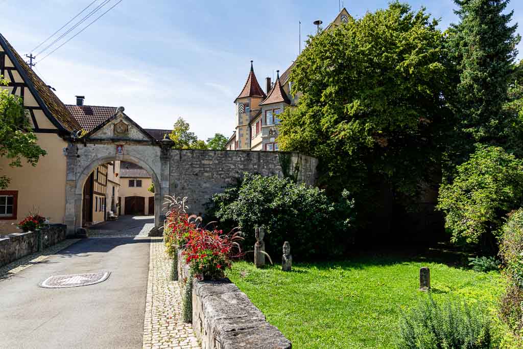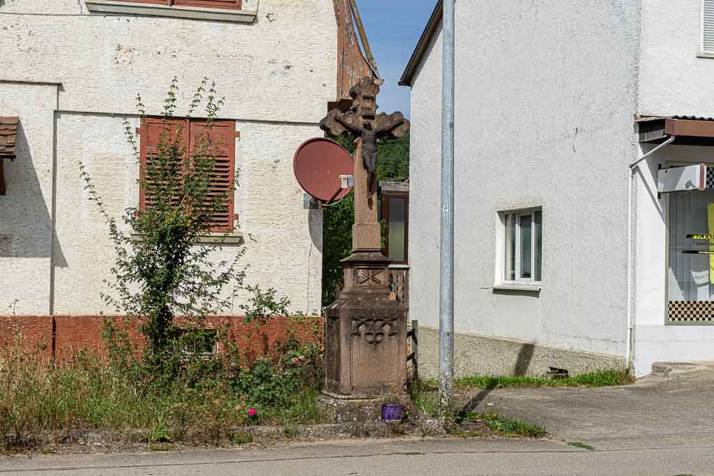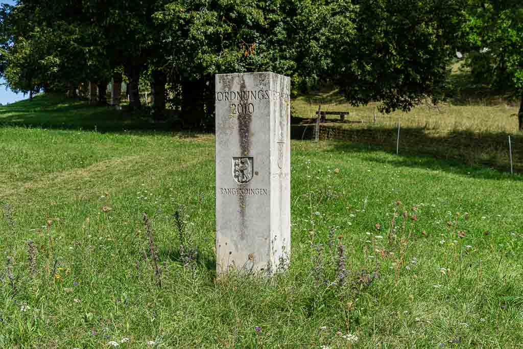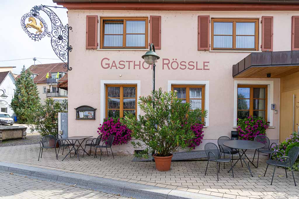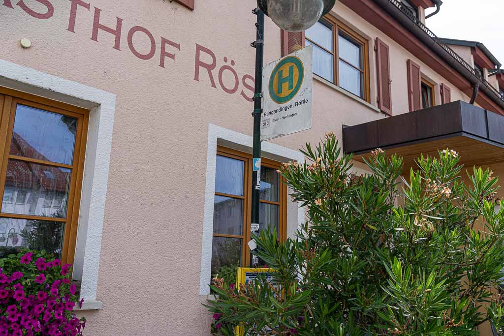 In der Ortsmitte von Rangendingen versteckt sich die Wegmarkierung auch scheu am Gasthof Rössle.