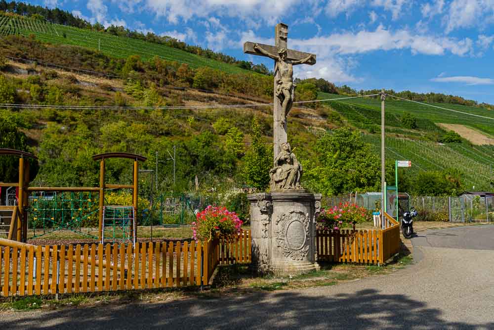 Überqueren Sie die Landstraße an der Straßenkreuzung. Gehen Sie nach rechts, vorbei am Bildstock "Heiligste Dreifaltigkeit" und