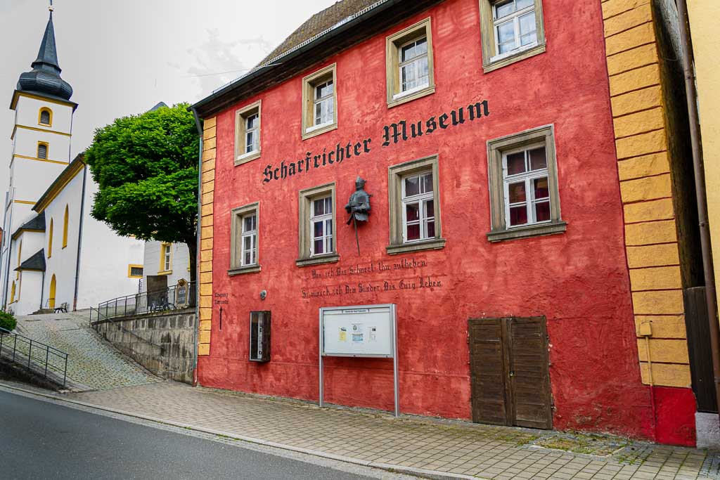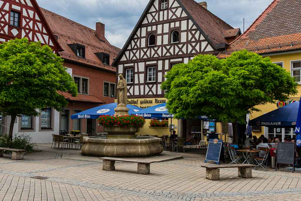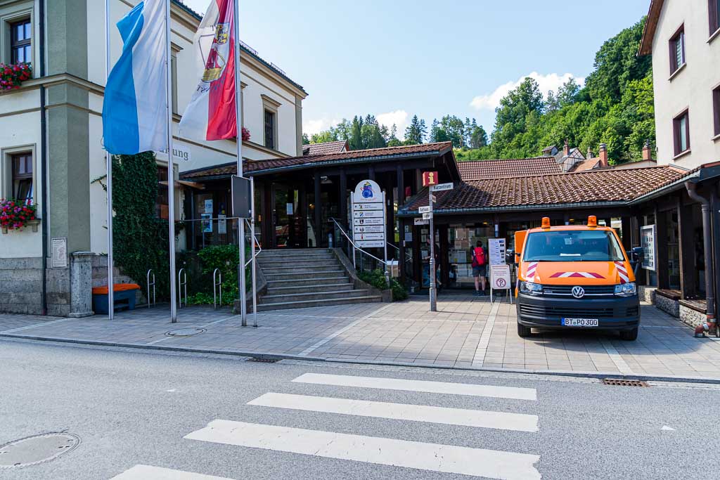 Ev. St. Bartholomäuskirche in Pegnitz (offen, Pilgerstempel im Pfarramt). Wir gehen vor zur Hauptstraße, gehen links am Bürgenzentrum vorbei und folgen der
