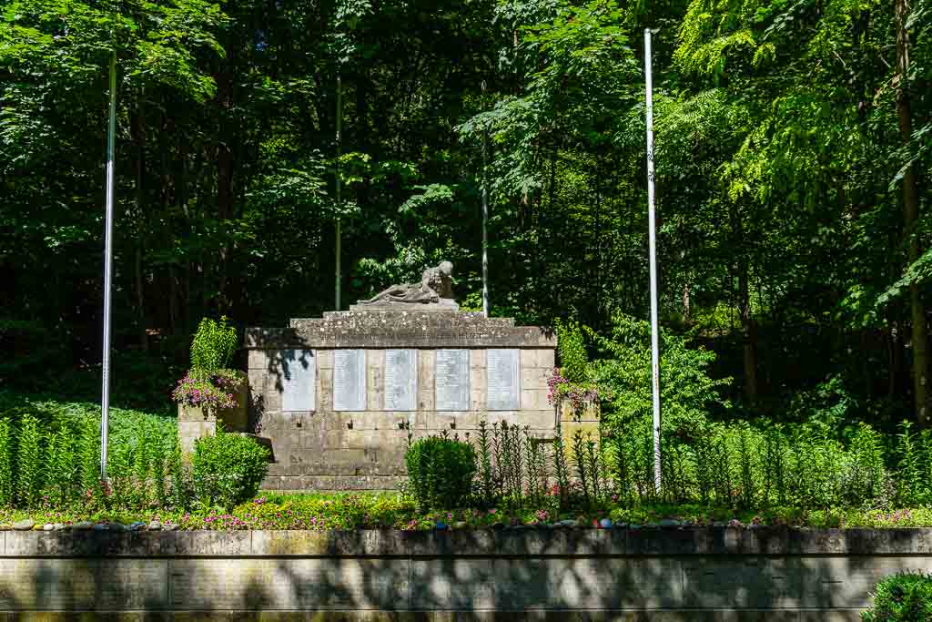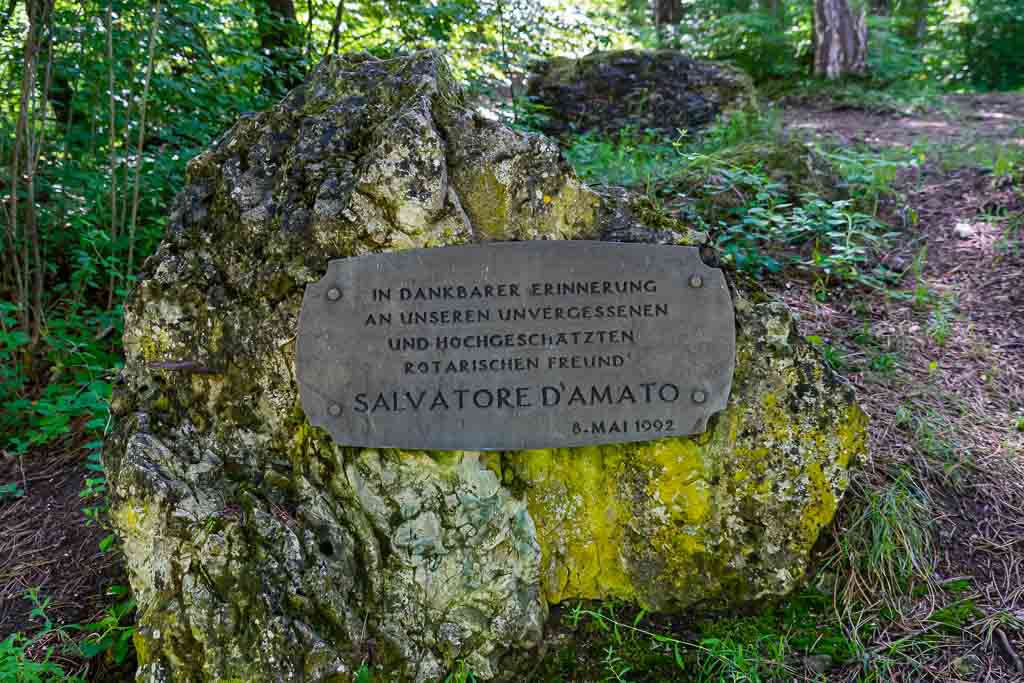 Hauptstraße bis zum Wege-T. An der Ampel sehen wir bereits linkerhand die Ausschilderung zum Schloßberg. Bei einer Übersichtstafel ganz unten finden wir auch den Hinweis auf den Jakobsweg.