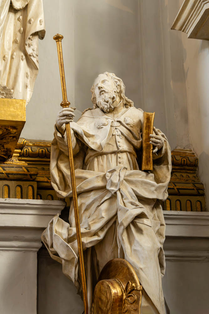 Jakobus im Hochaltar (18. Jh.). Nische mit den drei Figuren (darunter Jakobus) aus der Flurkapelle hinter dem Ort. Weitere Jakobusfigur außen über dem Westeingang. Weiter über die Kirchstraße,