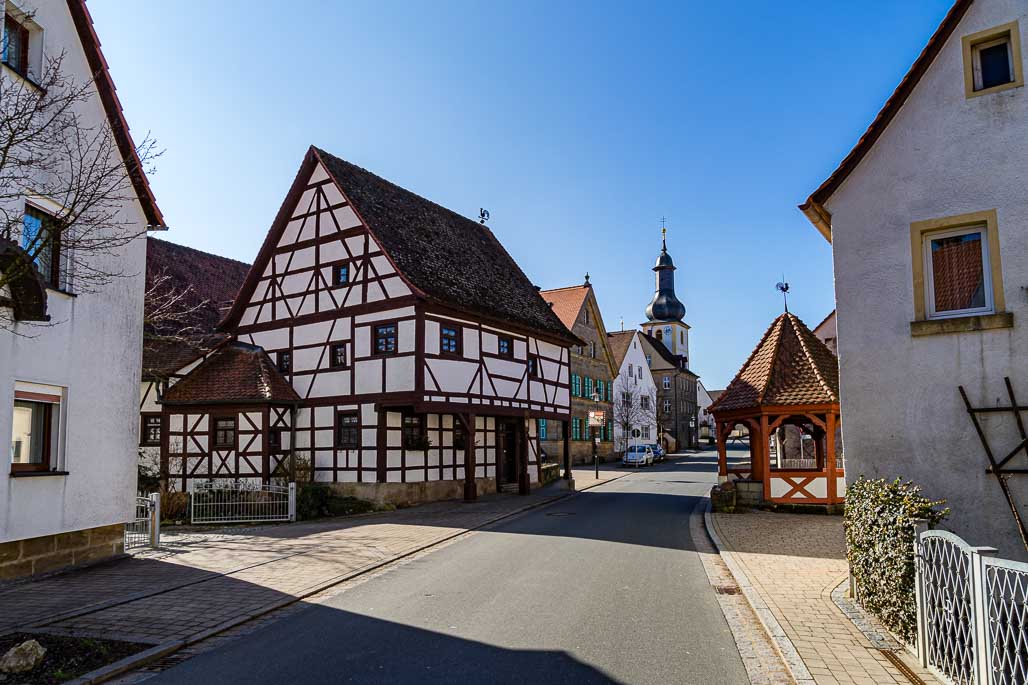 Am Waldende Beginn des Forchheimer Ortsteils Burk. Auf der Röthenstraße durch den Ort.