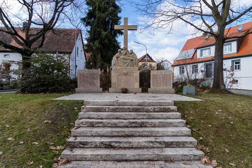 Zurück zum Kriegerdenkmal. Vor der Kirchenmauer Informationskasten mit Wegmarkierung. Dieser folgen.